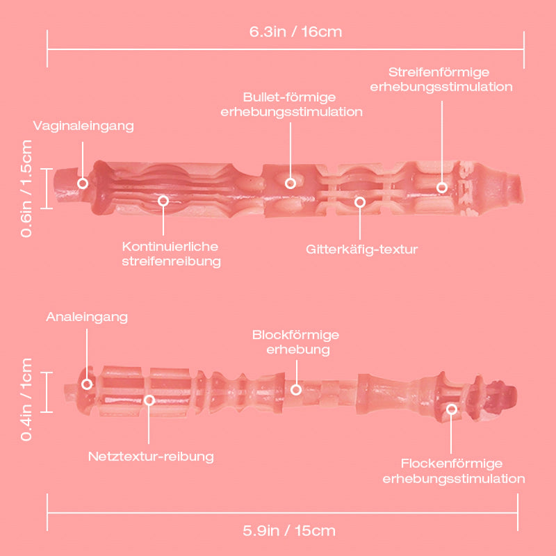 Bevor Sie jedoch in Erwägung ziehen, Ihre eigenen Utensilien für die sexuelle Selbstbefriedigung in eine Tantaly-Puppe mit Tantaremoval®-Technologie einzuführen, sollten Sie sich vergewissern, dass die Außenlängen der einzelnen Kanäle mit dem Material des eingeführten Objekts kompatibel sind, das wiederum mit dem TPE-Material kompatibel ist. (Bitte führen Sie keine Silikonprodukte in den Hohlraum der Tantaly-Puppe ein, um chemische Reaktionen zu vermeiden)